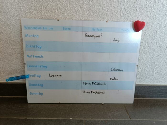 Ich habe aus einem Bilderrahmen einen beschreibbaren Wochenplan gemacht, den ich jederzeit aktuell halten kann.
